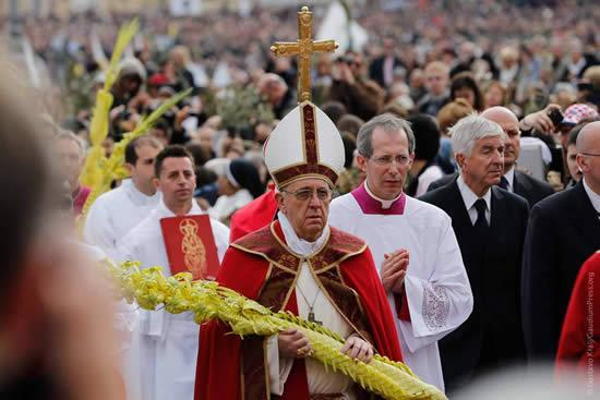 Cidade do Vaticano (Segunda-feira, 25-03-2013, ) Com a Praça de São Pedro tomada por fiéis dos cinco continentes, inicia-se a procissão de Ramos, nesse domingo, 24 de março. Era o primeiro Domingo de Ramos que o Papa Francisco estava presente como Sumo Pontífice.