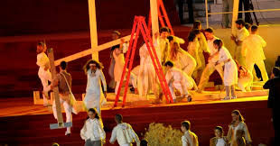 3. O campo como canteiro de obras. Quando o nosso coração é uma terra boa que acolhe a Palavra de Deus, quando se “sua a camisa” procurando viver como cristãos, nós experimentamos algo maravilhoso: nunca estamos sozinhos, fazemos parte de uma família de irmãos que percorrem o mesmo caminho; somos parte da Igreja, mais ainda, tornamo-nos construtores da Igreja e protagonistas da história. São Pedro nos diz que somos pedras vivas que formam um edifício espiritual (cf. 1Pe 2,5). E, olhando para este palco, vemos que ele tem a forma de uma igreja, construída com pedras, com tijolos. Na Igreja de Jesus, nós somos as pedras vivas, e Jesus nos pede que construamos a sua Igreja; e não como uma capelinha, onde cabe somente um grupinho de pessoas. Jesus nos pede que a sua Igreja viva seja tão grande que possa acolher toda a humanidade, que seja casa para todos! Ele diz a mim, a você, a cada um: «Ide e fazei discípulos entre todas as nações»! Nesta noite, respondamos-lhe: Sim, também eu quero ser uma pedra viva; juntos queremos edificar a Igreja de Jesus! Digamos juntos: Eu quero ir e ser construtor da Igreja de Cristo!