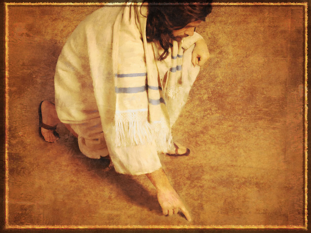 A cena se realiza na esplanada do templo. Jesus está ensinando às pessoas e eis que chegam alguns escribas e fariseus que arrastam diante Dele uma mulher que tinha sido pega em adultério. Esta mulher se encontra ali, entre Jesus e a multidão, entre a misericórdia do Filho de Deus e a violência, a raiva de seus acusadores. Na realidade, eles não foram ao Mestre para pedir-lhe o seu parecer, mas para fazer-lhe uma armadilha. De fato, se Jesus seguir a severidade da lei, aprovando a lapidação da mulher, perderá a sua fama de mansidão e bondade que tanto fascina o povo; se ao invés for misericordioso, irá contra a lei que Ele mesmo disse não querer abolir, mas cumprir.