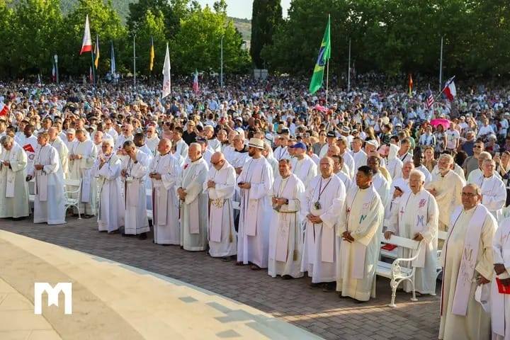 Aqui, na escola de Maria, chegamos a essa paz, plenitude e totalidade, sobretudo no despertar da consciência da nossa eleição. Aqui somos chamados de "Queridos filhos", "Pequeninos". Aqui, muitos redescobriram a sua dignidade fundamental, única e inalienável: ser filhos de Deus. Que alegria ter um Pai no céu, que está sempre presente e que não posso cair mais fundo do que nas suas mãos! Que esperança no seu chamado, como diria São Paulo. E por isso te agradeço, Senhor, porque neste lugar de graça descobrimos que não somos apenas produtos do acaso na cultura dos órfãos, mas teus filhos amados, que não o são porque mereceram, mas porque nos quiseste, porque és amor. Como o Cardeal Fernández nos lembrou lindamente de uma das mensagens de Nossa Senhora na conferência realizada no Vaticano sobre a situação de Medjugorje: "Nem todas as religiões do mundo são iguais perante Deus. Mas todos vós sois meus filhos." Todos vós sois meus filhos. Concede-nos, Senhor, um pouco do teu coração para que nas adversidades da vida possamos sempre ver o que é importante – somos todos teus filhos – e para que possamos proteger uns aos outros, a nós mesmos, a nossa relação contigo, Senhor, e o ambiente em que vivemos.