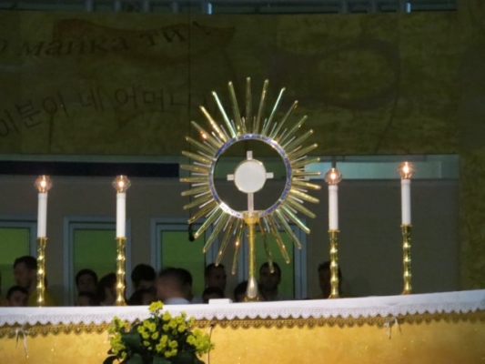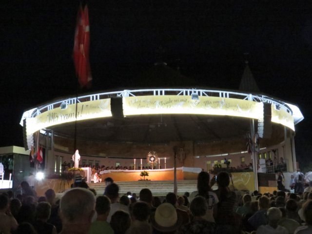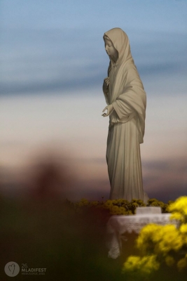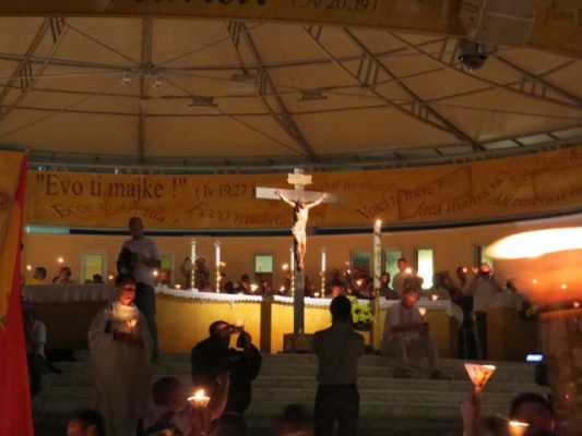 o inicio e as atividades do centro de oração denominado “Uma luz de Maria” e falou da propagação das mensagens de Nossa Senhora, nos países da ex União Soviética. Em seguida começou o programa litúrgico de oração noturna e às 19 hs, o Frei Marin Karačić, sacerdote da Provincia franciscana da Bosnia Herzegovina, presidiu a santa Missa que foi concelebrada por 528 sacerdotes. A homilia foi feita por Frei Marinko Šakota, pároco de Medjugorje. Durante a celebração Eucarística, no momento da oração dos fieis, foi levado ao altar, para ser oferecido a Deus, um longo mural sobre o qual os jovens, nestes dias do encontro, escreveram suas orações e seus agradecimentos. Após a Missa houve a Adoração Eucaristica, e ao término os sacerdotes deram a bênção a todos os jovens,cujos representantes de cada país, receberam presentes simbólicos – um bastão e um Terço. Agora terão uma missão no regresso aos seus países. Após a despedida com musicas e louvores, os jovens dirigiram-se ao Krizevac onde às 5hs da manhã, foi celebrada a Santa Missa que encerrou o Encontro.