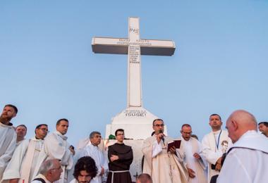 Frei Marinko Sakota, o pároco, no topo da Montanha da Cruz às 5 da manhã. O Festival da Juventude começou na quarta-feira, 1º de agosto de 2018 e foi realizado sob o tema “Vivendo na Palavra de Deus”, quando dezenas de milhares de jovens de 72 países se reuniram.